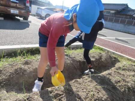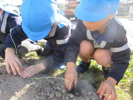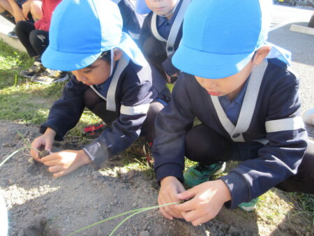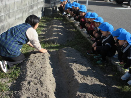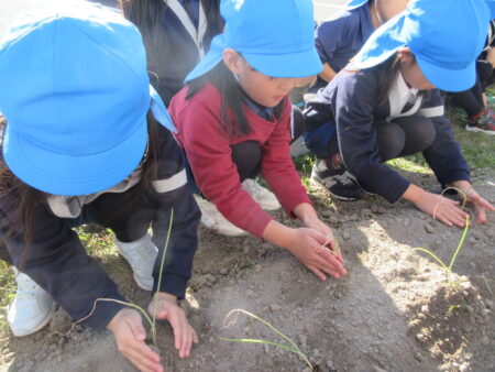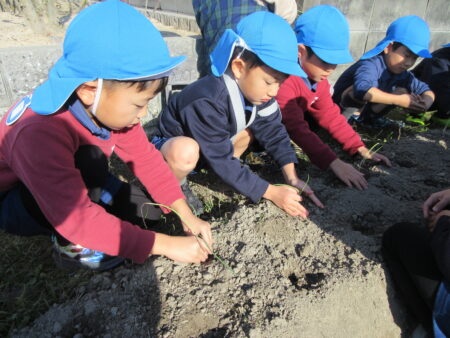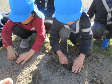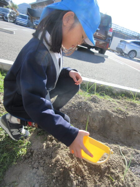 TOP > お知らせ > まめっちょ農園~玉ねぎ~つき組 お知らせ まめっちょ農園~玉ねぎ~つき組 まめっちょ農園に初めて玉ねぎを植えることになりました。 畝に目印の丸い跡をつけていたので、自分が植える場所を選び小さな苗をそっと土に植えました。 いつも食べている玉ねぎとは違いとっても細く小さい苗にちょっと緊張気味のつき組さん。 優しく・優しく・そーっと・・・。 収穫は来年の5月頃の予定なので、今のつき組さんは収穫体験はできませんが、来年の収穫までしっかりお世話をして、来年のつき組・ほし組・そら組さんに引き継ぎたいと思います。 美味しく育ちますように!!! 2025.12.05
